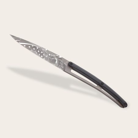 Ebenholz, das den Griff dieser Deejo Messer ziert, ist eine wahre Ode an tiefstes Schwarz. Das Besondere an dieser außergewöhnlichen Holzart ist, dass sie praktisch unempfindlich gegenüber Umgebungsfeuchtigkeit ist. Sie ist das dichteste, widerstandsfähigste und wertvollste Material, das es gibt – ideal für diese wunderschönen Messer.