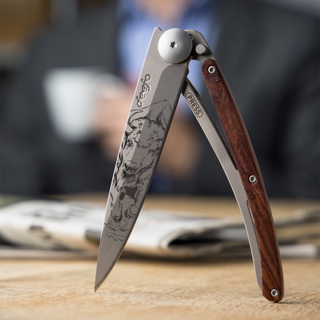 Photo d'un couteau Deejo personnalisé avec le tatouage Bison