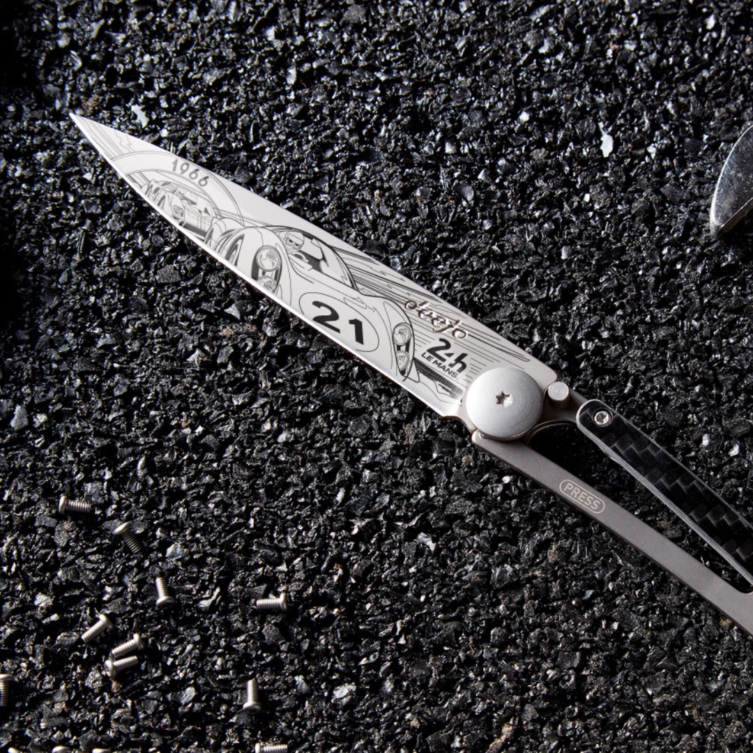 Photo d'un couteau Deejo personnalisé avec le tatouage 24 du Mans