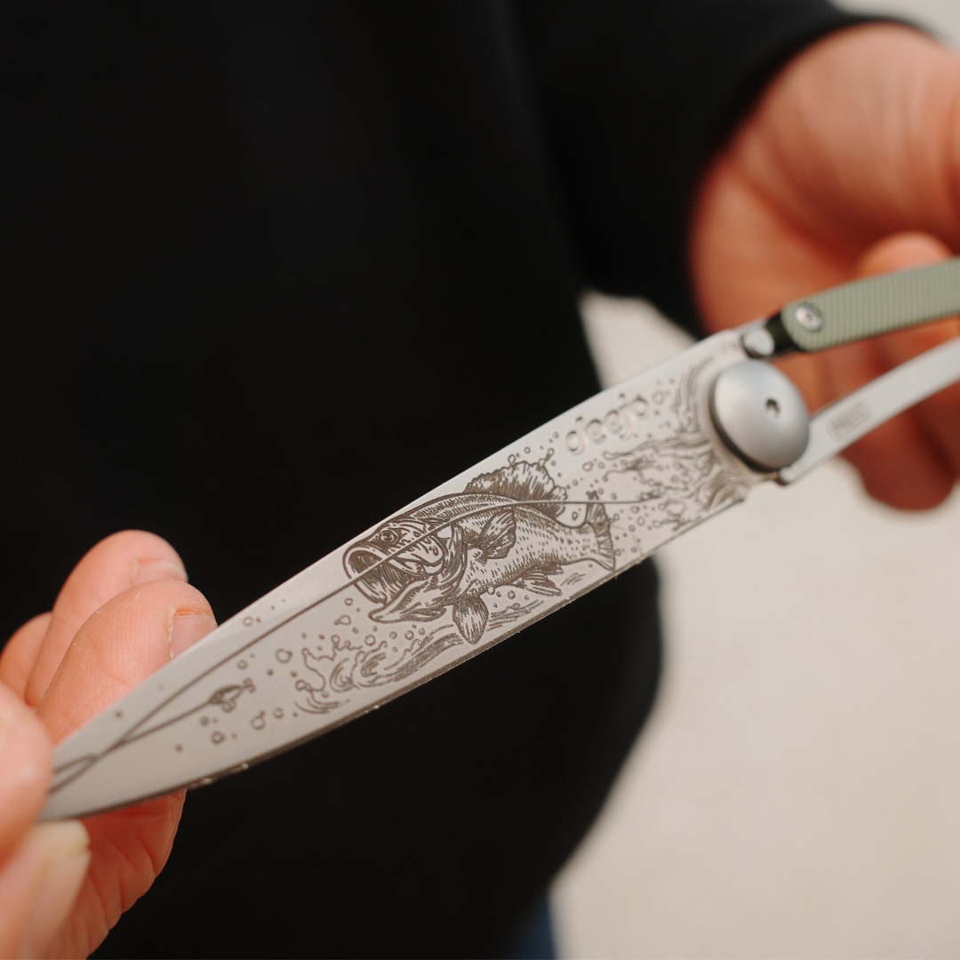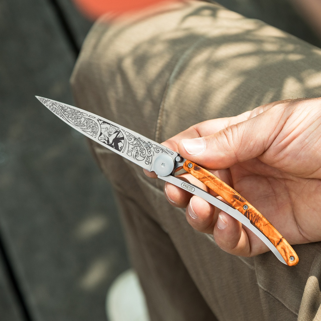 Photo d'un couteau Deejo personnalisé avec le tatouage D-Day