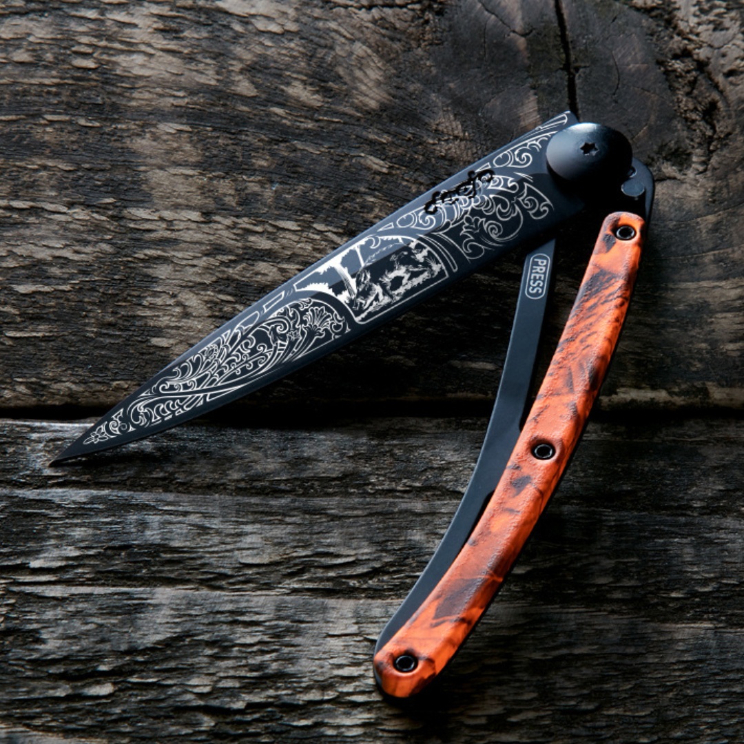 Photo d'un couteau Deejo personnalisé avec le tatouage Sanglier