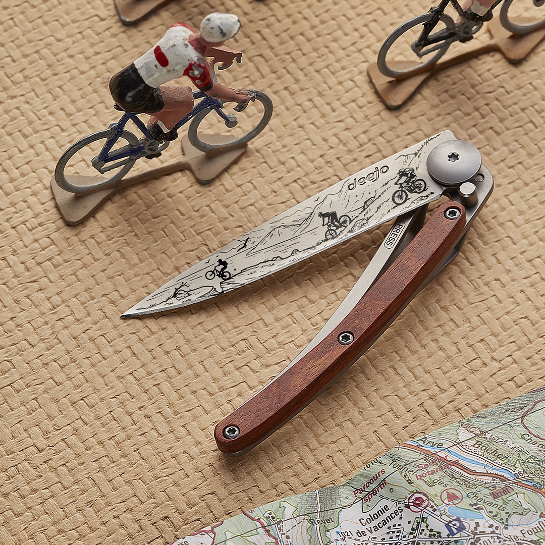 Photo d'un couteau Deejo personnalisé avec le tatouage VTT