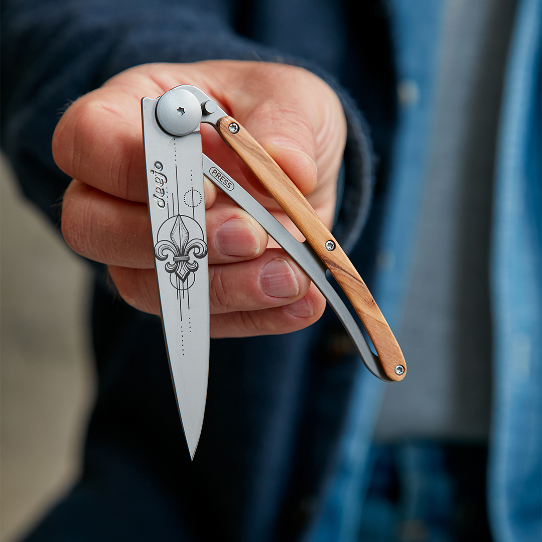 Photo d'un couteau Deejo personnalisé avec le tatouage Fleur de Lys