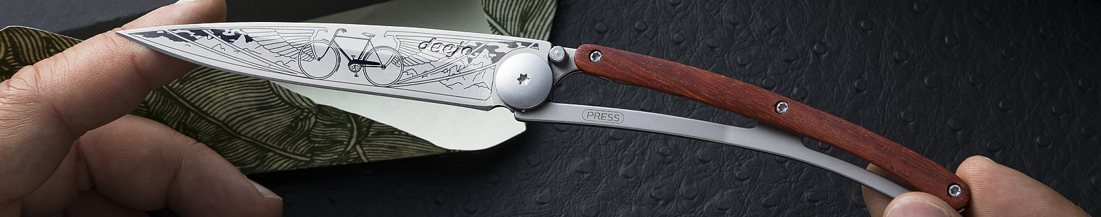 Deejo Messer können von der Klingenspitze bis zum Griffende personalisiert werden. Probieren Sie es aus und kreieren und tätowieren Sie ein Deejo, das nur Ihm ähnelt.