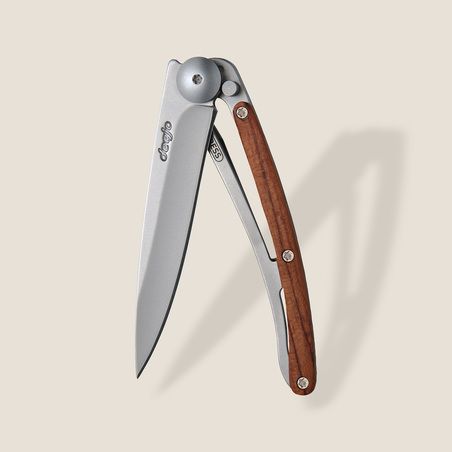 Dieses Deejo Messer ist mit massivem Korallenholz (oder Padouk) verziert. Diese Holzart wird wegen ihrer wertvollen roten / bernsteinfarbenen Akzente (daher der Name), ihrer Robustheit und ihrer ausgezeichneten Feuchtigkeitsbeständigkeit in der Messerschmiedekunst seit Langem geschätzt. Hier unterstreicht es auf wunderbare Weise die Eleganz eines Deejo Messers.