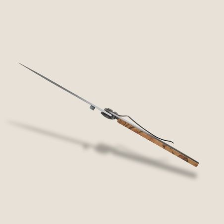 Der Griff ist hier mit einem Aluminiumplättchen verziert, das mithilfe von Wassertransferdruck mit einem Tarnmuster versehen wurde. Dieses ganz in Brauntönen gehaltene Plättchen, das aufgrund seiner Robustheit und seines geringen Gewichts ausgewählt wurde, erinnert an die subtilen Farben des Herbstes. Dieses Finish wird von Anglern und Jägern ebenso geschätzt wie von Naturliebhabern und ist insbesondere für den Gebrauch im Freien geeignet.