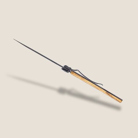 Ultraleichtes Messer aus Z40C13 Edelstahl mit schwarzer Oberfläche. Klinge mit ‚Liner-Lock‘ Sicherheitssperre dekoriert mit einer feinen Lasergravur. Gürtelclip. Griff aus Olivenholz.