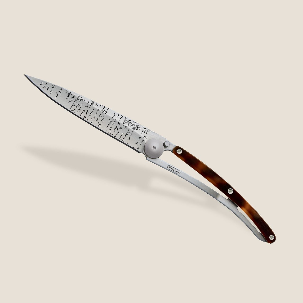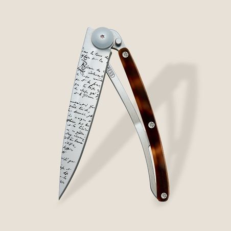 Der Schildpatt, der unsere Deejo Messer ziert, stammt aus einem Verbundmaterial aus Celluloseacetat, das hauptsächlich in der Brillenindustrie verwendet wird. Seit Jahrzehnten ersetzt dieses synthetische Material echtes Schildpatt, da es ihm zum Verwechseln ähnelt. Dieses robuste, leuchtende Material, das so nuancenreich ist wie die Artenvielfalt der Natur, erweist sich als besonders geeignet, um die Eleganz unserer Messer zu unterstreichen.