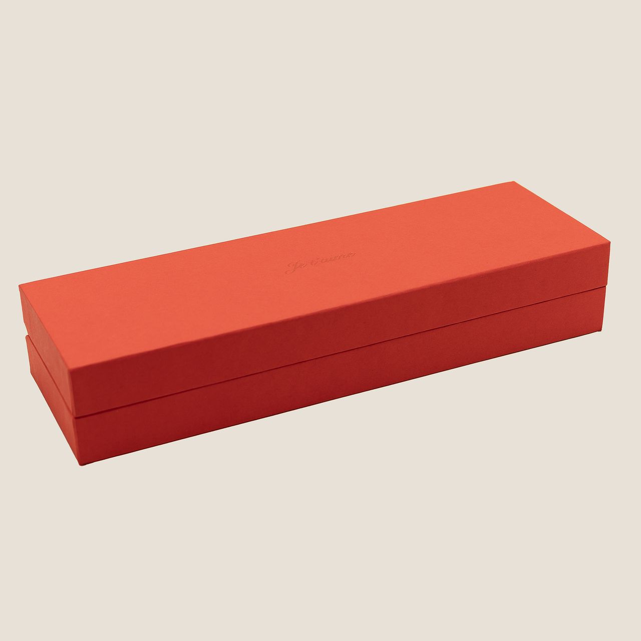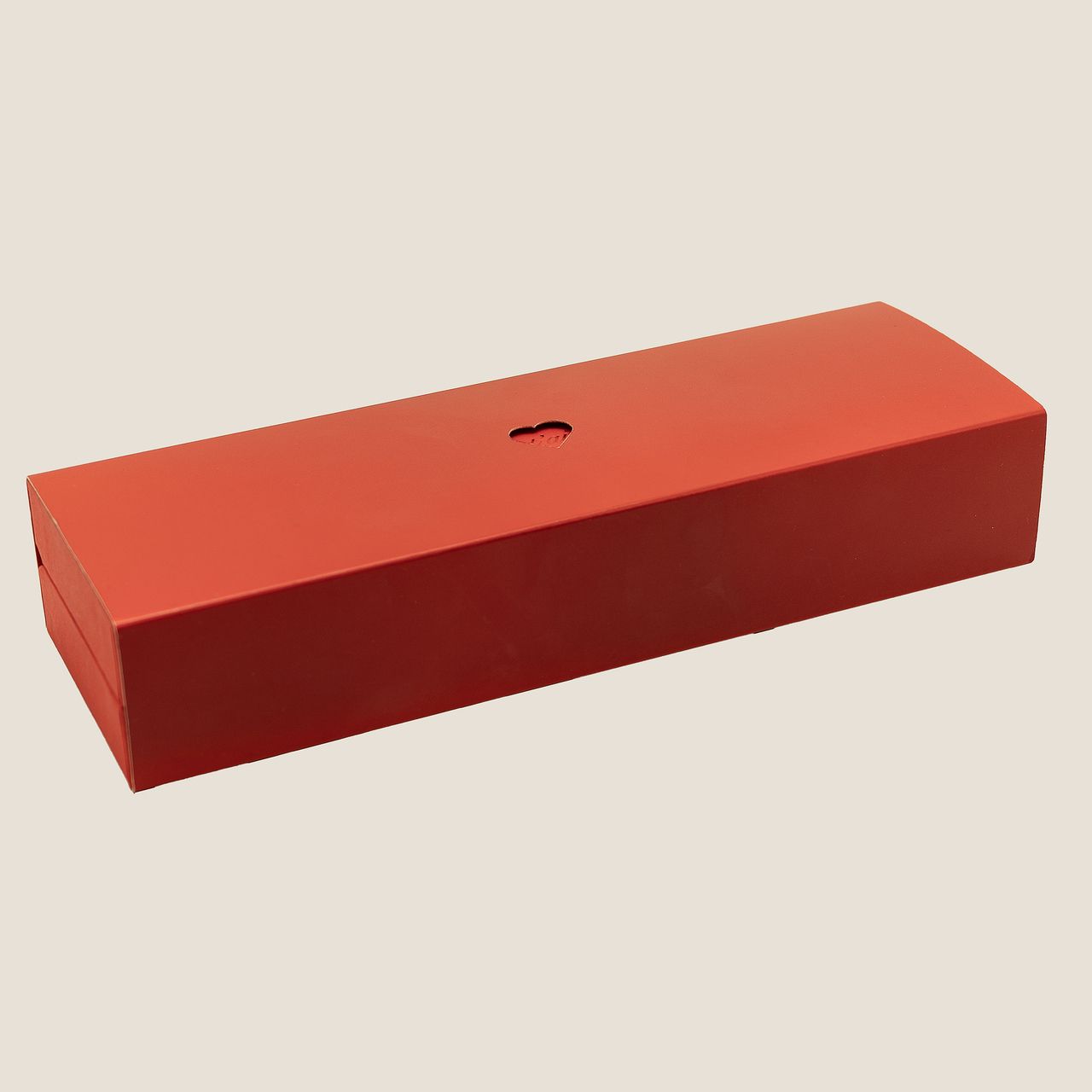 Die Schachtel, aus dickem Karton von bemerkenswerter Robustheit gefertigt, ist mit einem leuchtend roten Papier in matter Ausführung umhüllt – tief und samtig.