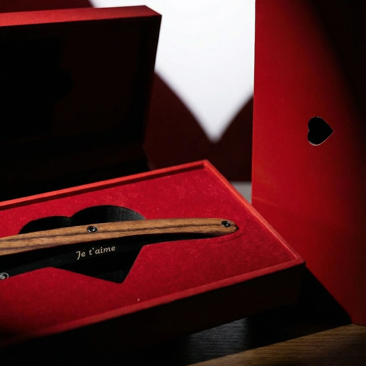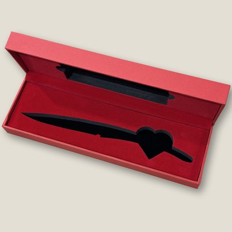 Ein leuchtend roter Karton-Schuber mit metallischem Finish umhüllt das Ganze; in der Mitte lässt eine dezente, herzförmige Aussparung die Botschaft erahnen – wie ein Versprechen. Innen schützt dicker EVA-Schaum, mit rotem Filz bezogen, das Messer; eine zweite, herzförmige Aussparung ermöglicht ein leichtes Entnehmen.