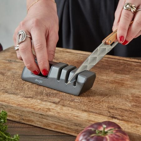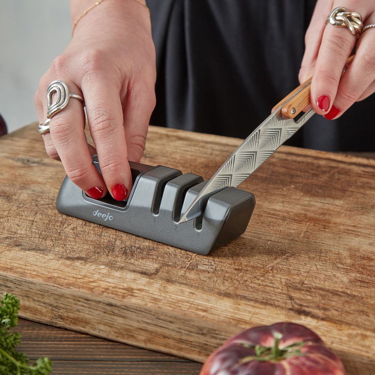 Der für unsere Messer optimierte Deejo Schleifer verfügt über einen festen Winkel, der perfekt auf die Schneide unserer Klingen abgestimmt ist. Einfach und unkompliziert schärfen Sie Ihr Messer, ohne Gefahr zu laufen, sich zu verletzen oder die Klinge zu beschädigen.