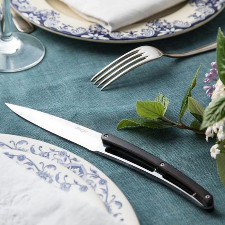 Die Deejo Messer passen sehr gut zu silbernen Gabeln und elegantem Tafelgeschirr.