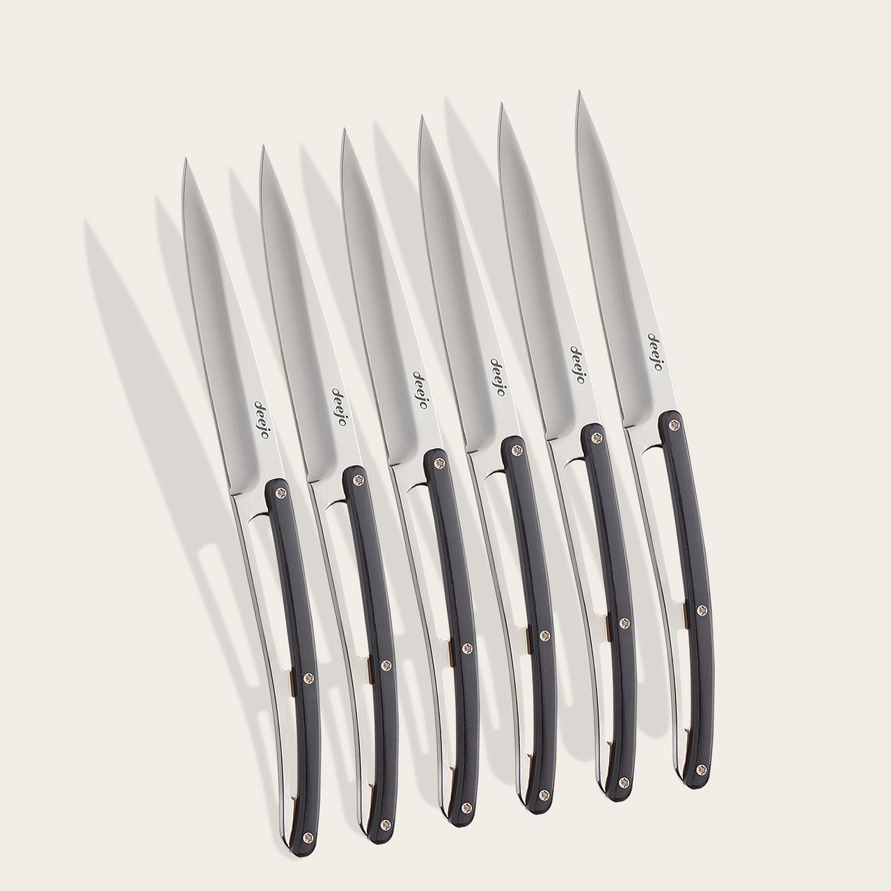 Dieses Set besteht aus 6 hochglanzpolierten Prestige-Tafelmessern mit feststehender Klinge (nicht klappbar) aus 2CR14 Stahl. Das Messer ist mit einem Glattschliff versehen. Griff aus Ebenholz.