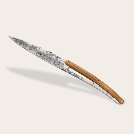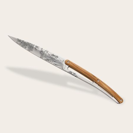 Olivenholz, das den Griff dieser Deejo Messer ziert, ist für seine Robustheit und seine antibakteriellen Eigenschaften bekannt. Es erfreut sich in der Messerschmiedekunst großer Beliebtheit. Jedes Stück ist je nach dem Baum, aus dem es gefertigt wurde, per se ein Unikat, das für seine Ästhetik und seine natürliche Maserung geschätzt wird. Es lässt Ihre Deejo Messer in wunderschönen Beigetönen erstrahlen, denen Feuchtigkeit oder Zeit nichts anhaben können.