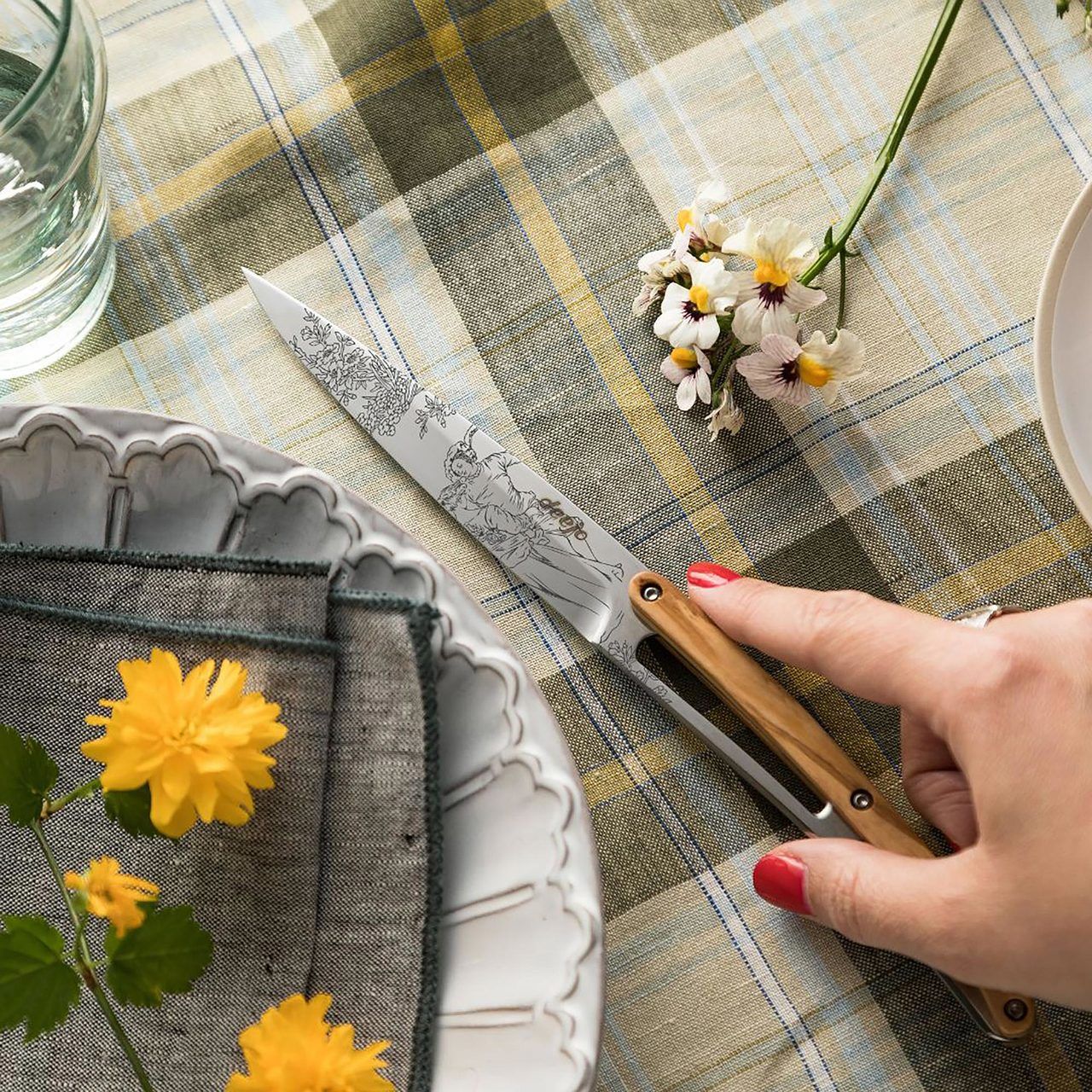 Eine subtile Mischung aus Tradition und Moderne: Die Klingen Ihres 6-teiligen Deejo Tafel-Sets sind mit sechs unterschiedlichen Tattoos versehen, um jeden Gast individuell anzusprechen. Ein weiteres Detail, das zusätzliche Begehrlichkeiten weckt ...