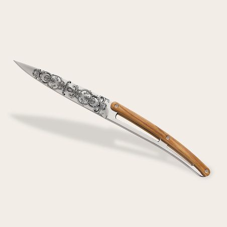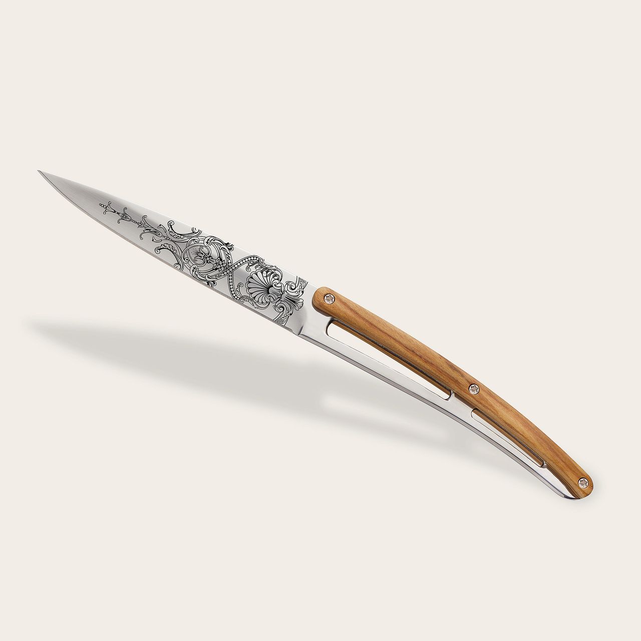 Olivenholz, das den Griff dieser Deejo Messer ziert, ist für seine Robustheit und seine antibakteriellen Eigenschaften bekannt. Es erfreut sich in der Messerschmiedekunst großer Beliebtheit. Jedes Stück ist je nach dem Baum, aus dem es gefertigt wurde, per se ein Unikat, das für seine Ästhetik und seine natürliche Maserung geschätzt wird. Es lässt Ihre Deejo Messer in wunderschönen Beigetönen erstrahlen, denen Feuchtigkeit oder Zeit nichts anhaben können.