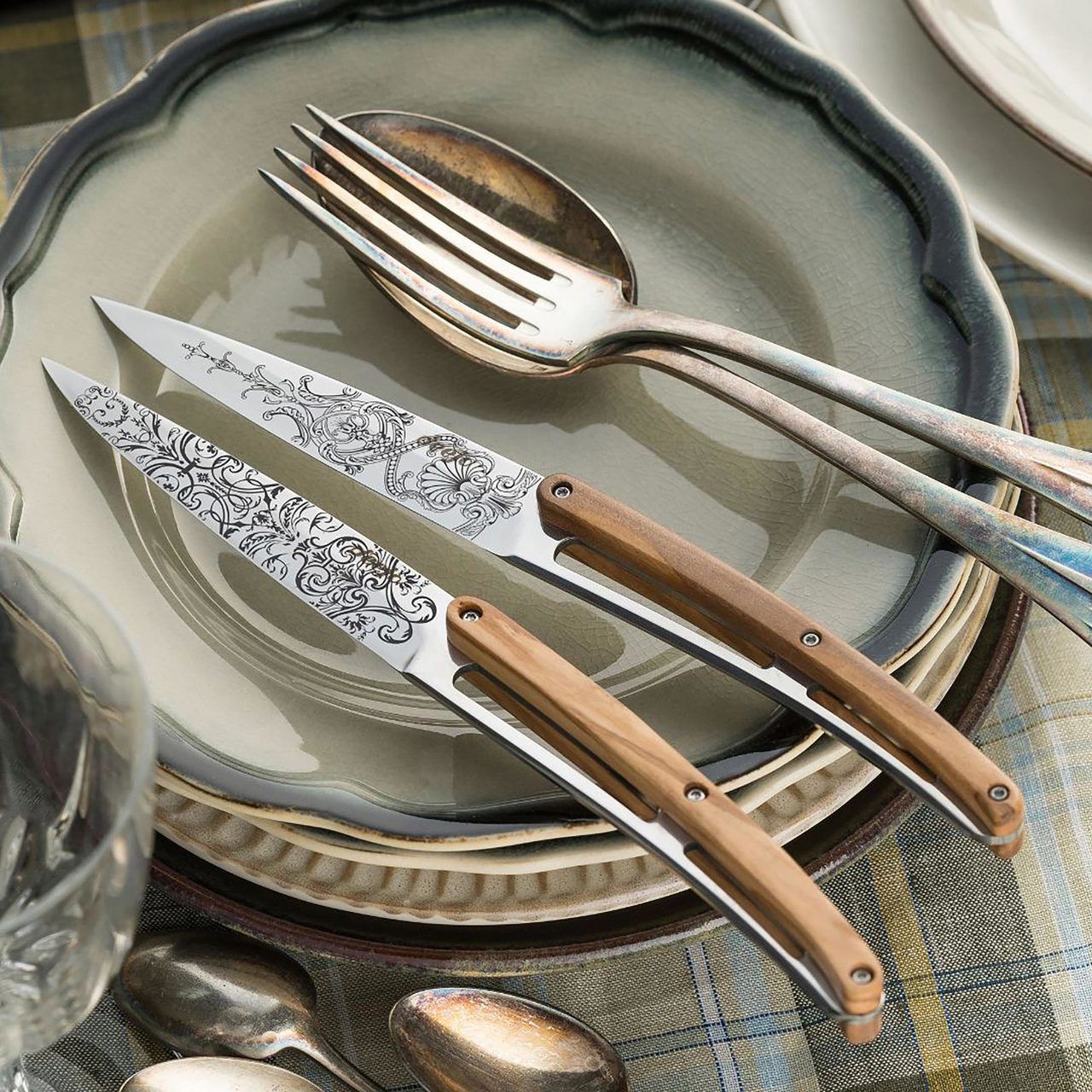 Die Deejo Messer passen sehr gut zu silbernen Gabeln und elegantem Tafelgeschirr.