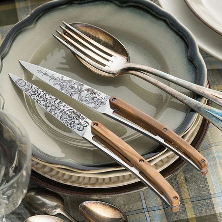 Eine subtile Mischung aus Tradition und Moderne: Die Klingen Ihres 6-teiligen Deejo Tafel-Sets sind mit sechs unterschiedlichen Tattoos versehen, um jeden Gast individuell anzusprechen. Ein weiteres Detail, das zusätzliche Begehrlichkeiten weckt ...