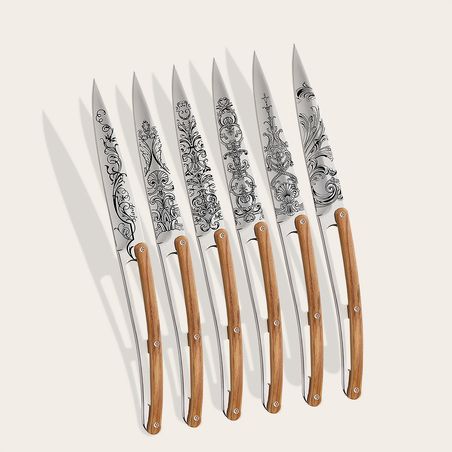 Dieses Set besteht aus 6 hochglanzpolierten Prestige-Tafelmessern mit feststehender Klinge (nicht klappbar) aus 2CR14 Stahl. Das Messer ist mit einem Glattschliff versehen. Griff aus Olivenholz.