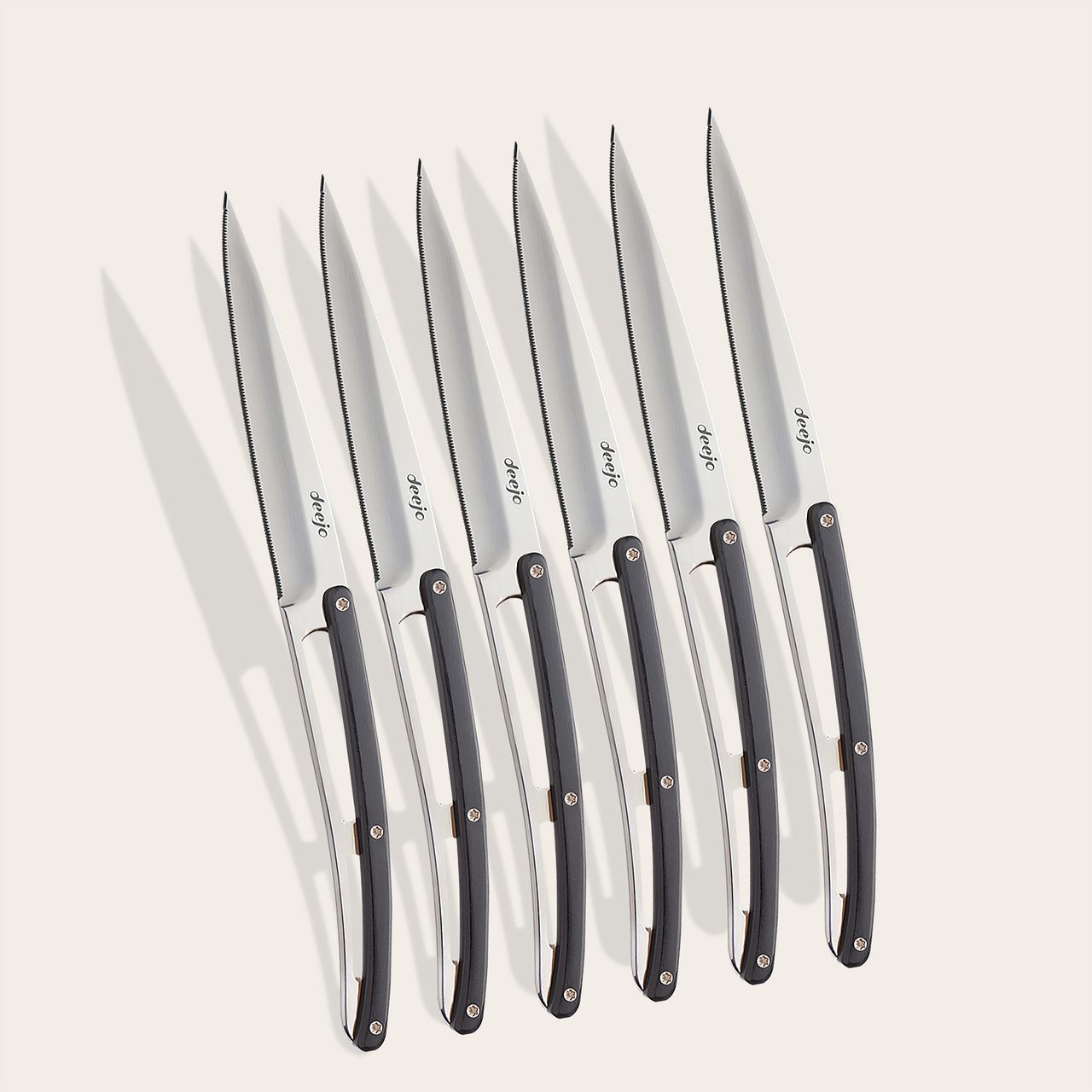 Dieses Set besteht aus 6 hochglanzpolierten Prestige-Tafelmessern mit feststehender Klinge (nicht klappbar) aus 2CR14 Stahl. Das Messer ist mit einer mikrogezahnten Klinge versehen. Griff aus Ebenholz.