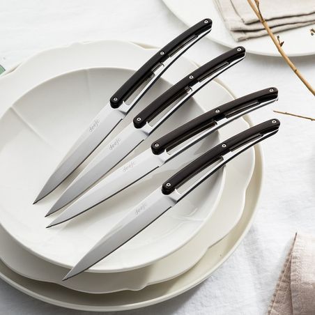 Die Deejo Messer passen sehr gut zu silbernen Gabeln und elegantem Tafelgeschirr.