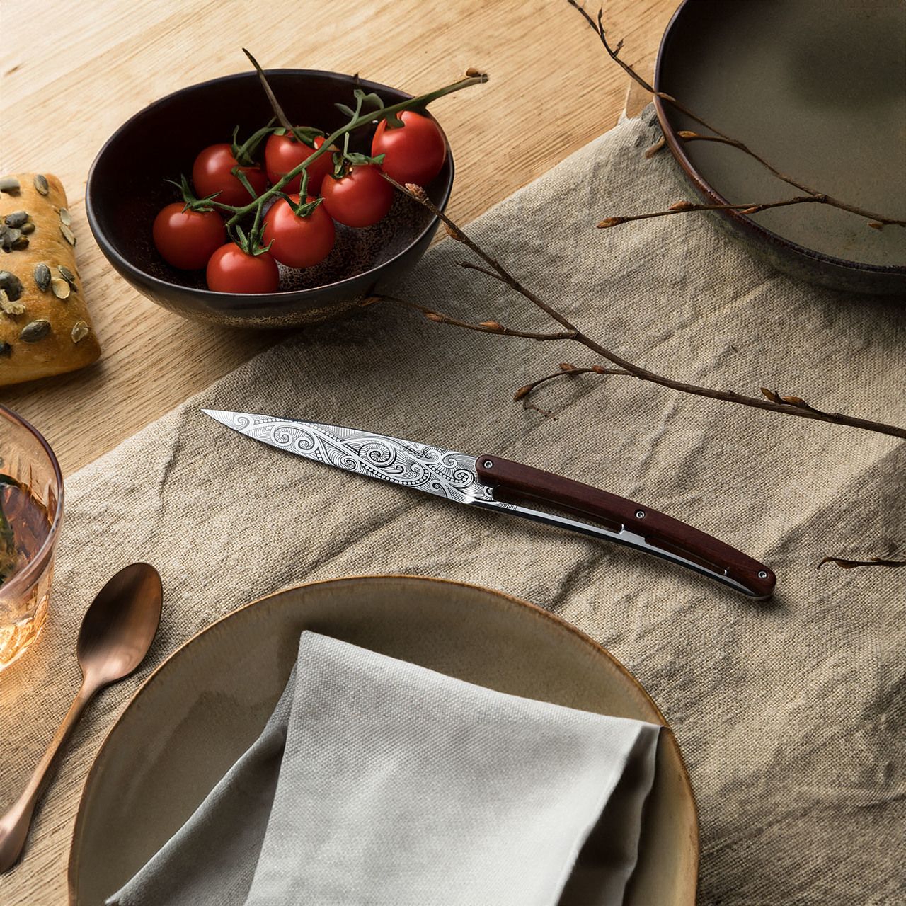 Die Deejo Messer passen sehr gut zu silbernen Gabeln und elegantem Tafelgeschirr.