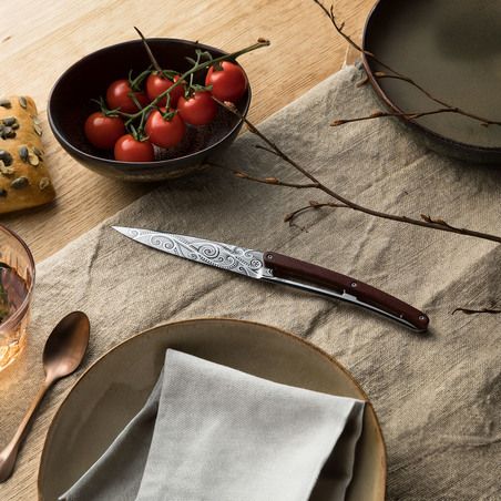 Eine subtile Mischung aus Tradition und Moderne: Die Klingen Ihres 6-teiligen Deejo Tafel-Sets sind mit sechs unterschiedlichen Tattoos versehen, um jeden Gast individuell anzusprechen. Ein weiteres Detail, das zusätzliche Begehrlichkeiten weckt ...