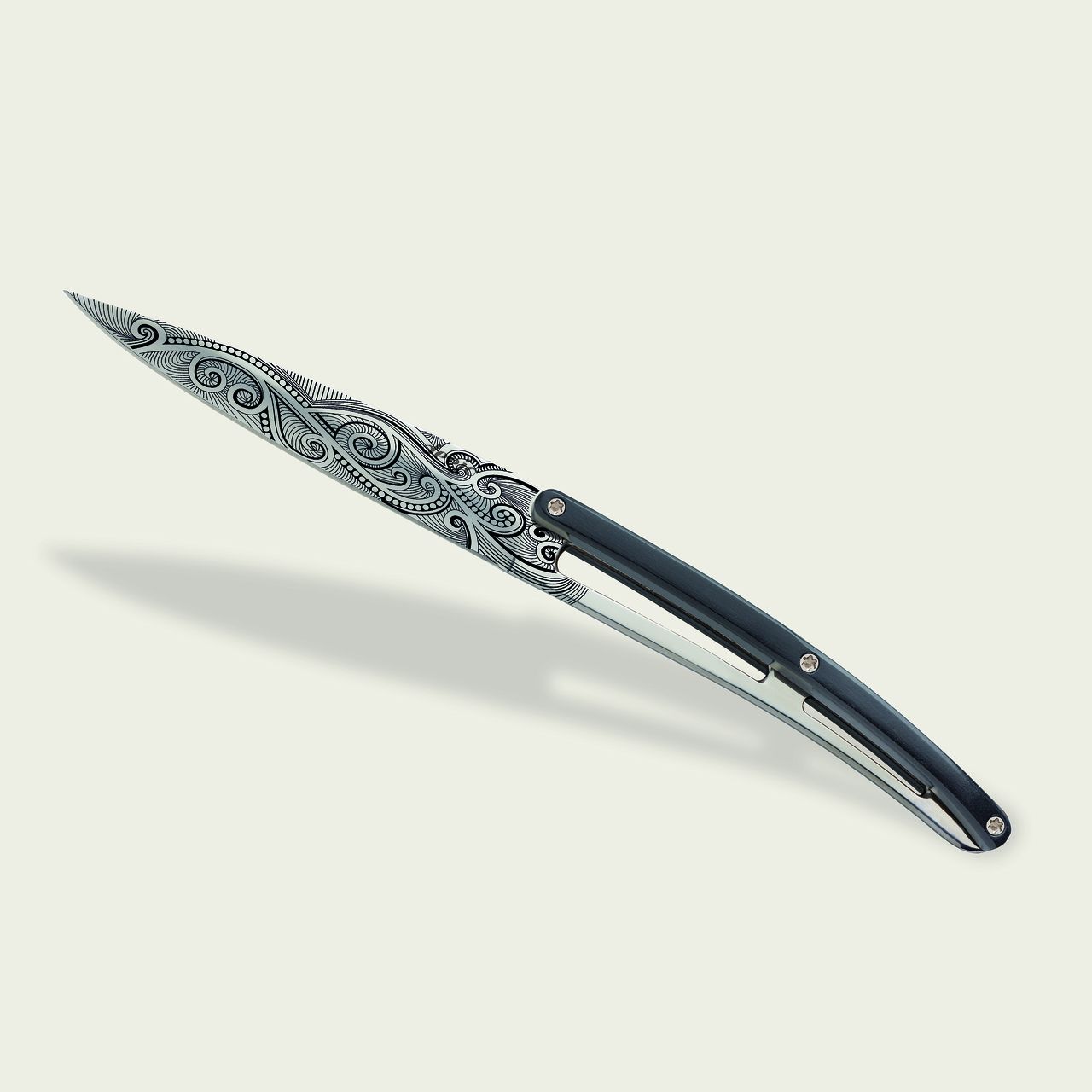 Ebenholz, das den Griff dieser Deejo Messer ziert, ist eine wahre Ode an tiefstes Schwarz. Das Besondere an dieser außergewöhnlichen Holzart ist, dass sie praktisch unempfindlich gegenüber Umgebungsfeuchtigkeit ist. Sie ist das dichteste, widerstandsfähigste und wertvollste Material, das es gibt – ideal für diese wunderschönen Messer.