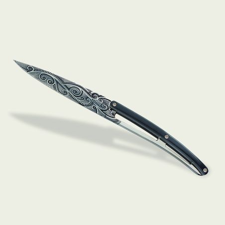 Die Tribal-Motive auf den scharfen Klingen dieses Sets aus 6 Deejo Tafelmessern bieten zahlreiche Details und werden von einem eleganten Plättchen aus Ebenholz vollendet. Erkennen Ihre Gäste die verschiedenen kulturellen Einflüsse (Maori, Polynesien, Wikinger, Inka, Kelten, Pazifik)?