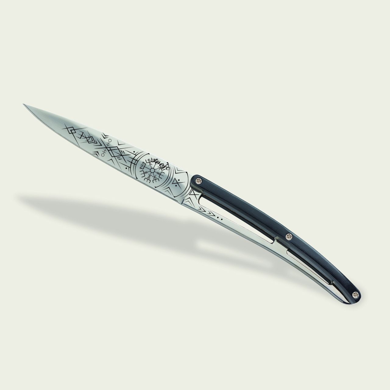 Eine subtile Mischung aus Tradition und Moderne: Die Klingen Ihres 6-teiligen Deejo Tafel-Sets sind mit sechs unterschiedlichen Tattoos versehen, um jeden Gast individuell anzusprechen. Ein weiteres Detail, das zusätzliche Begehrlichkeiten weckt ...
