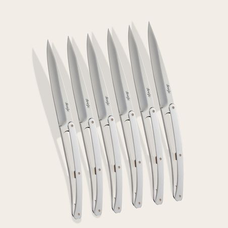 Dieses Set besteht aus 6 hochglanzpolierten Prestige-Tafelmessern mit feststehender Klinge (nicht klappbar) aus 2CR14 Stahl. Das Messer ist mit einem Glattschliff versehen. Griff aus verchromtem Zamak.