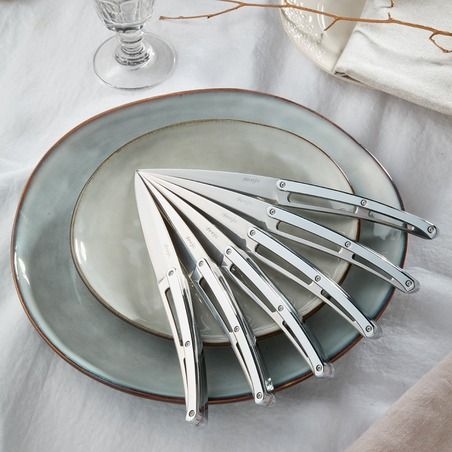 Als perfekte Verbindung von Tradition und Moderne werden die eleganten und klaren Linien dieser Tafelmesser wunderbar mit den Glanz von Chrom geschmückt, das die Ästhetik dieser feinen viel gerühmten Klingen wunderbar akzentuiert.
