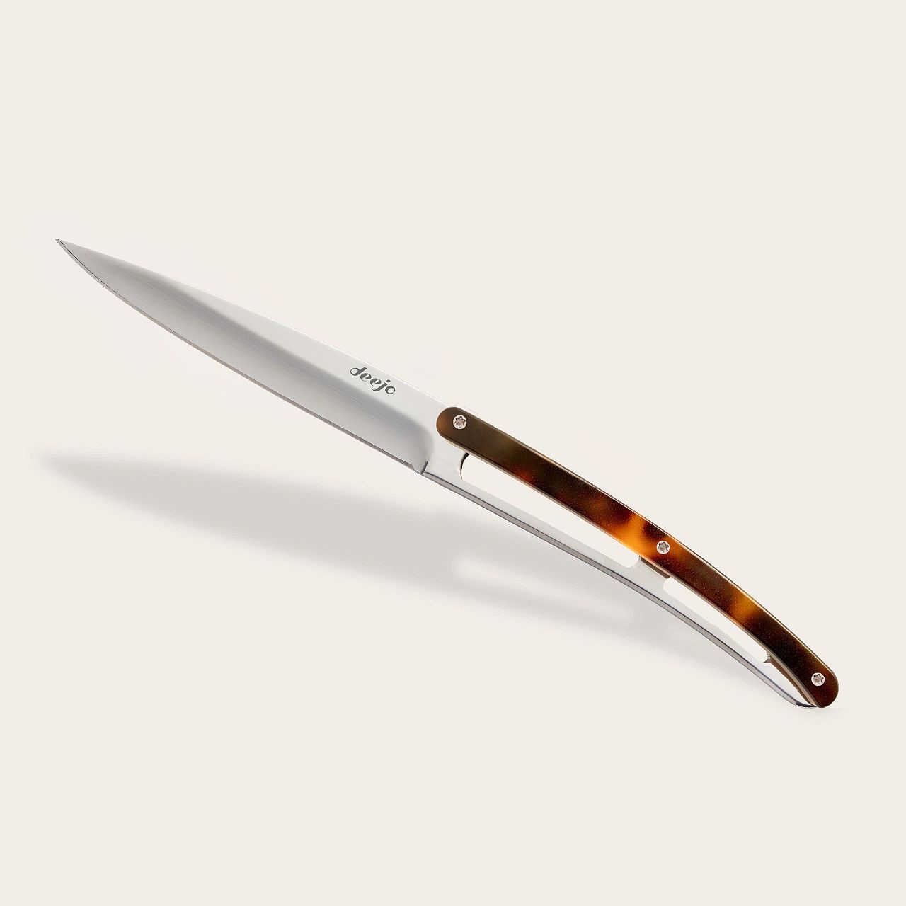 Der Schildpatt, der unsere Deejo Messer ziert, stammt aus einem Verbundmaterial aus Celluloseacetat, das hauptsächlich in der Brillenindustrie verwendet wird. Seit Jahrzehnten ersetzt dieses synthetische Material echtes Schildpatt, da es ihm zum Verwechseln ähnelt. Dieses robuste, leuchtende Material, das so nuancenreich ist wie die Artenvielfalt der Natur, erweist sich als besonders geeignet, um die Eleganz unserer Messer zu unterstreichen.
