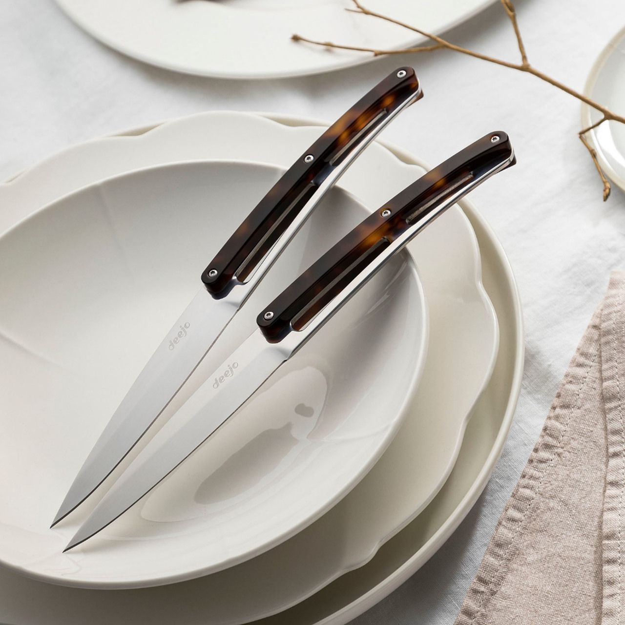 Die Deejo Messer passen sehr gut zu silbernen Gabeln und elegantem Tafelgeschirr.