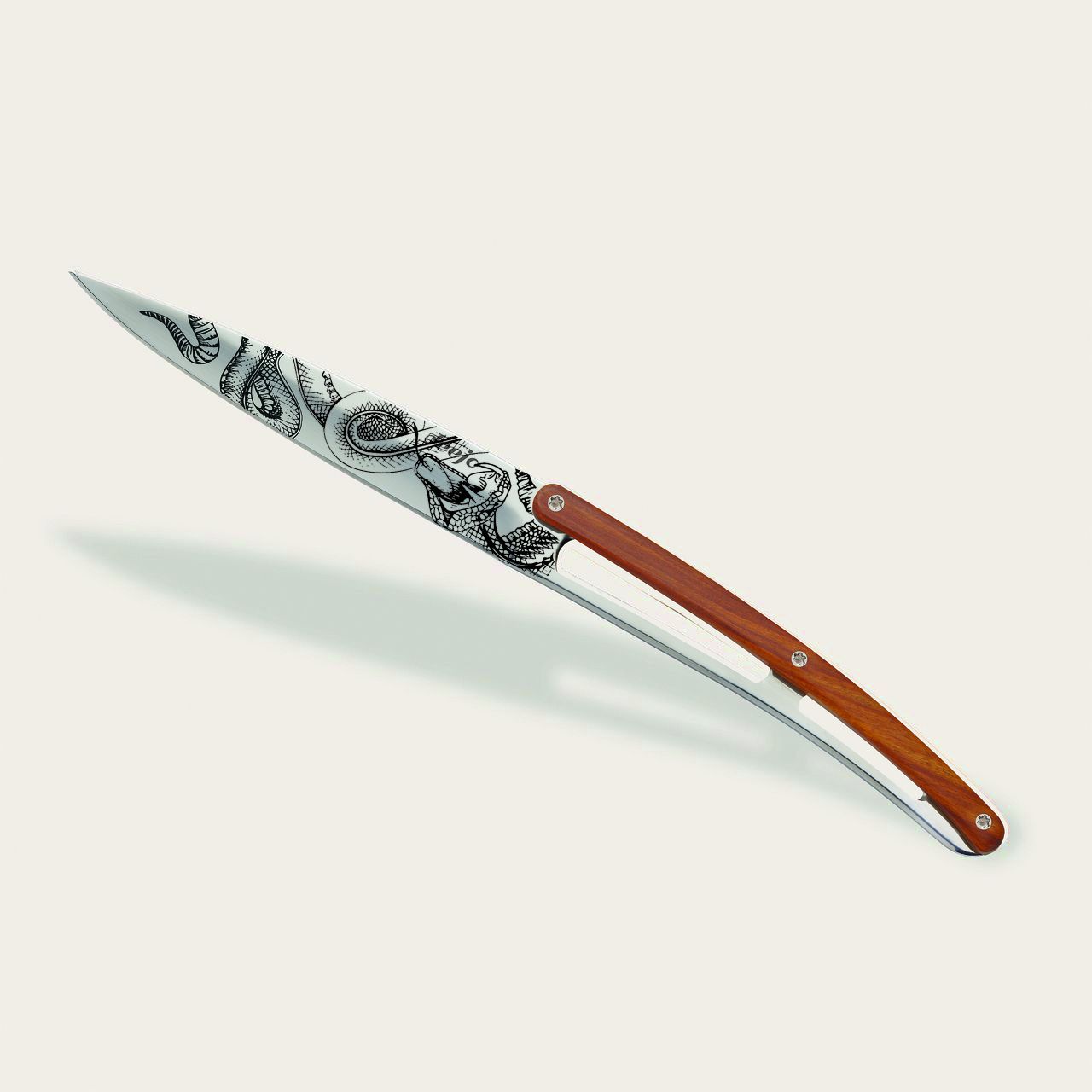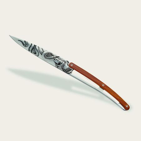 Diese Tafelmesser sind mit massivem Korallenholz (oder Padouk) verziert. Diese Holzart wird wegen ihrer wertvollen roten / bernsteinfarbenen Akzente (daher der Name), ihrer Robustheit und ihrer ausgezeichneten Feuchtigkeitsbeständigkeit in der Messerschmiedekunst seit Langem geschätzt. Hier unterstreicht es auf wunderbare Weise die Eleganz unserer Deejo Messer.
