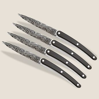 Weil Leistung bei Deejo nie auf Kosten des Designs geht, trägt jedes Messer ein fein graviertes Tattoo. Es verleiht diesen funktionalen Messern Charakter, Identität und einen unverwechselbaren Look.
