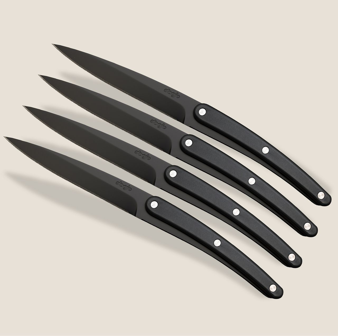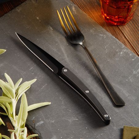Dieses Set besteht aus 4 Restaurant-Tafelmessern mit schwarzer Oberfläche. Feststehender Klinge (nicht klappbar) aus 2CR13 Edelstahl. Mikroverzahnte Klinge. Griff aus Polycarbonat und ABS in Ebenholzoptik. Spülmaschinenfest.