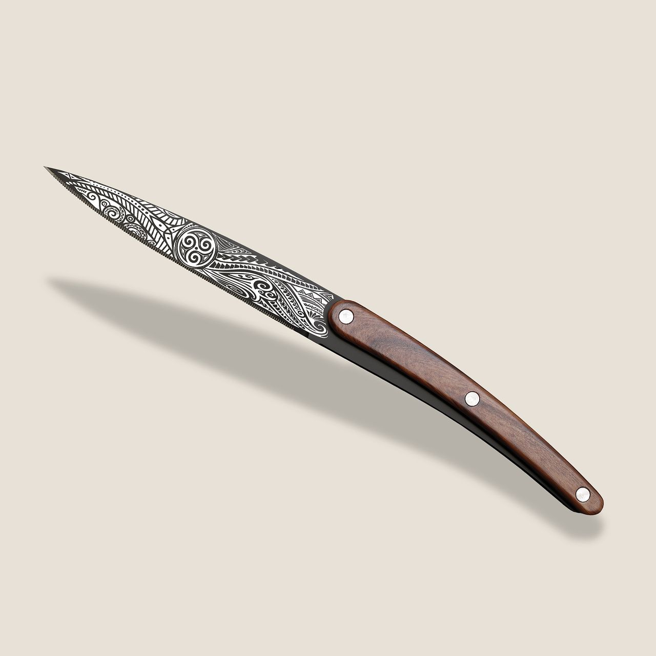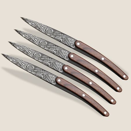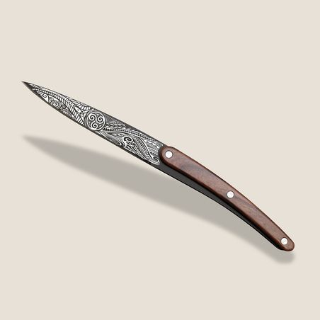 Weil Leistung bei Deejo nie auf Kosten des Designs geht, trägt jedes Messer ein fein graviertes Tattoo. Es verleiht diesen funktionalen Messern Charakter, Identität und einen unverwechselbaren Look.