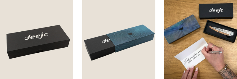 Bis zum 17. Mai erhältst du beim Kauf eines personalisierten Deejo Taschenmessers mit dem Code BESTDAD26 eine irisierende, schimmernde Geschenkbox. Exklusiv gestaltet für diesen Anlass.